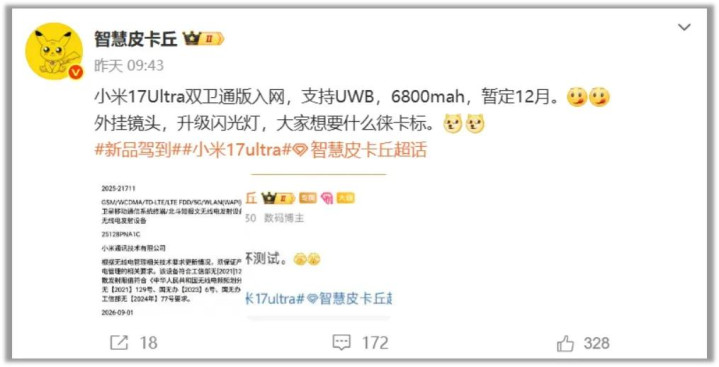 与此同时,数码博主智慧皮卡丘表示:“小米17Ultra双卫通版入网,支持UWB,6800mah,外挂镜头,升级闪光灯,暂定12月。”