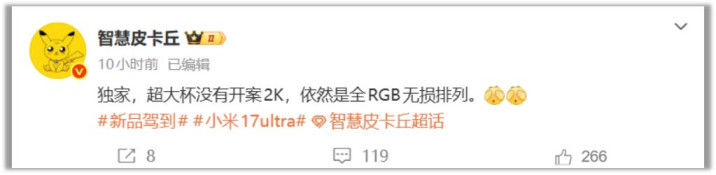 数码博主智慧皮卡丘透露,小米17 Ultra将搭载新一代全RGB无损显示技术,告别传统的2K分辨率屏幕,实现更先进的显示素质。